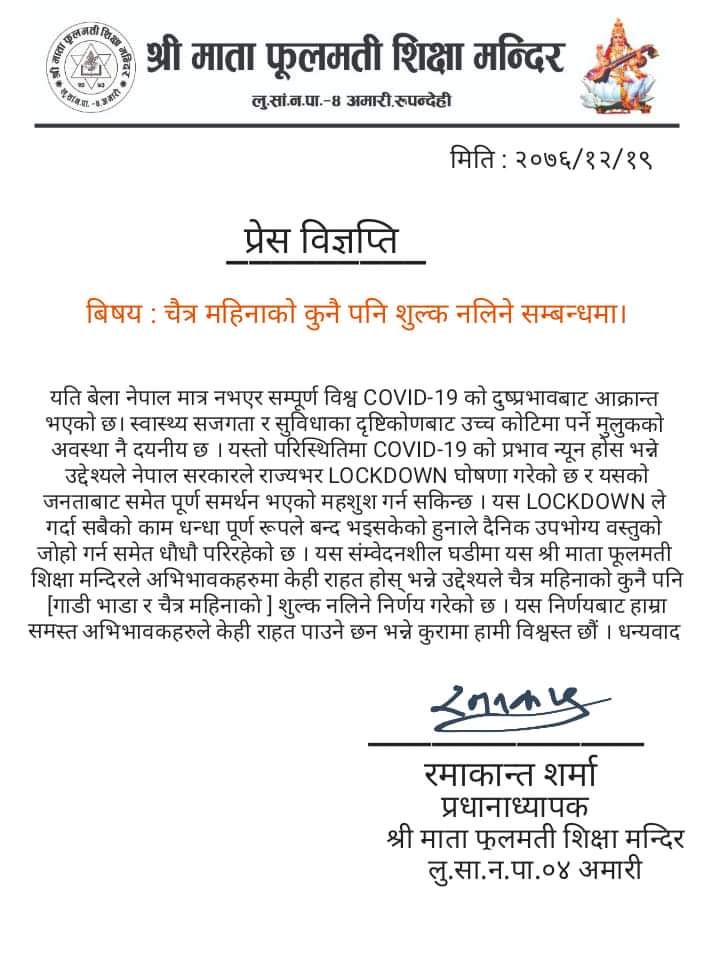 लुम्बिनी – श्री माता फुलमती शिक्षा मन्दिर  लु.सा.न.पा.-४ अमारी,रुपन्देहीका प्रधानाध्यापक श्री रमाकान्त शर्माले आज एक प्रेस बिज्ञप्ति जारी गरि आफना बिद्यार्थीको अभिबावकको लागि राहतको घोषणा गरेका छन् ।यश कोरोना भाइरसको कारण पुरै देश लकडाउनमा रहेको हुदा जन्ता आर्थिक र भौतिक दुबै समस्यामा परेका छन् ।