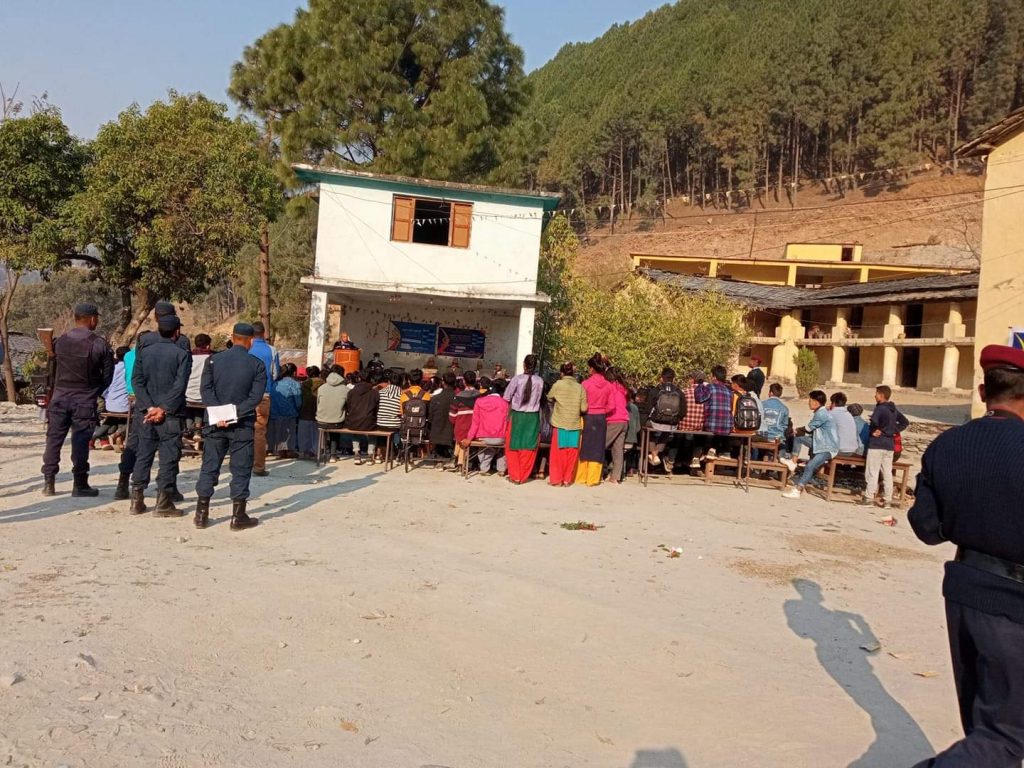 अाज समुदाय प्रहरी साझेदारी कार्यक्रम अन्तरगत बिद्यालय सम्पर्क कार्यक्रम लाई सम्मान गर्दै मानवत वादी राजा जयपृथ्वी बहादुर सिह काे जन्मथलो पुगेका सुवेदीले भने,अहिले देशमा हत्या हिँशा वलत्कार वढीरहेकाे छ । समाज भड्किलो बन्दै गएको बताउदै, कञ्चनपुरकि निर्मला पन्त र बैतडीकि भागरथी भट्टकाे जस्तै बझाङकि सम्झना विक लगाएत अमृत सिह जस्ता धेरै लाई काेड गर्दै डिअाईजी सुवेदीले आफै विभिन्न दुरदराजका बस्तीमा पुगेर यस्ता अनैतिक कृयाकलाप राेक्नका लागि विद्यार्थी शिक्षक लगाएत जनसमुदायहरुलाई सचेत गर्नकाे लागि जनचेतनामूलक कार्यक्रम गर्दै आफैले सचेतना जगाउने कार्यक्रममा लागिरहेकाे बझाङ जिल्ला प्रहरी प्रमुख डिएसपी रुपक खड्काले बताए ।