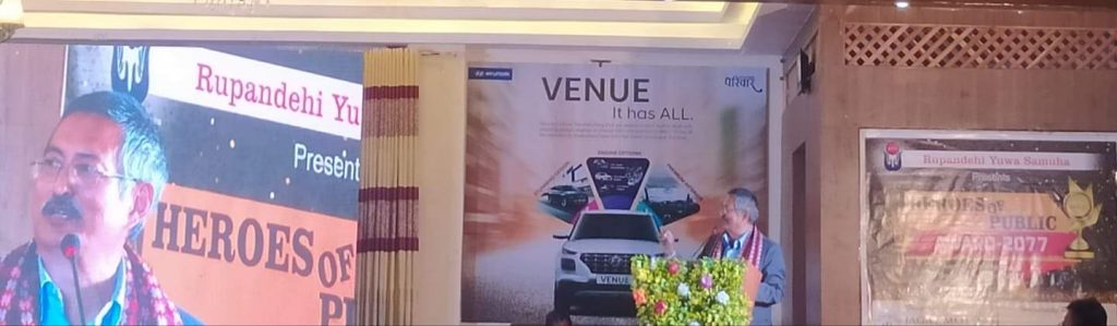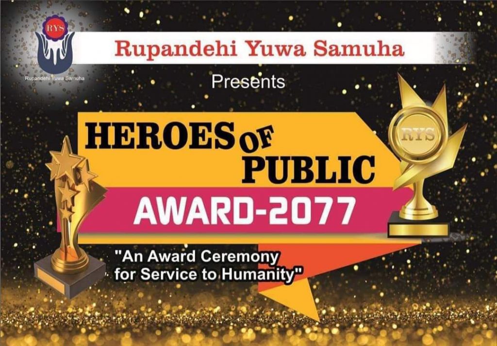 रुपन्देही युवा समुहको आयोजनामा हिरोज अफ पब्लिक अवार्ड २०७७ शनिबार एक कार्यक्रमका बिच भैरहवामा सम्पन्न भएको छ ।रुपन्देही युवा समुहका जिल्ला अध्यक्ष बिशाल गुप्ताको अध्यक्षता तथा नेपाली कांग्रेसका केन्द्रिय सदस्य तथा संसदिय दलका प्रमुख सचेतक बालकृष्ण खाणको प्रमुख आथित्यतामा कार्यक्रम सम्पन्न भएको हो ।