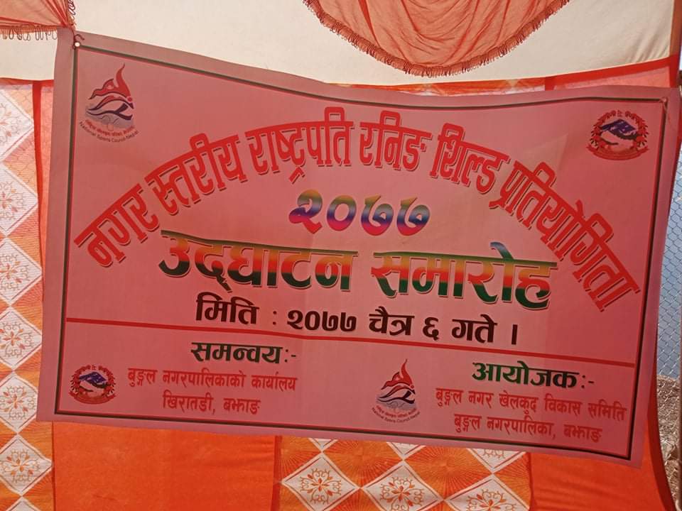 जिल्ला काे बुङ्गल नगरपालिका मा नगर स्थरीय रनिङ सिल्ड प्रतियोगिता सुरु भएको छ । अाज एक कार्यक्रमका विच बुङ्गल नगरपालिकामा राष्ट्रपति रनिङ्गसिल्डकाे उदघाटन भएको हाे । बुङ्गल नगर खेलकुद समितिकाे अायाेजनामा नगरपालिकामा रहेका विद्यालयहरु सहभागी रहनुभएकाे थियाे ।
