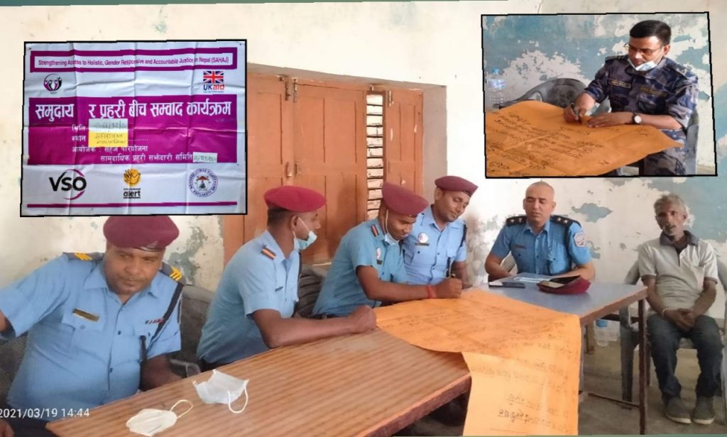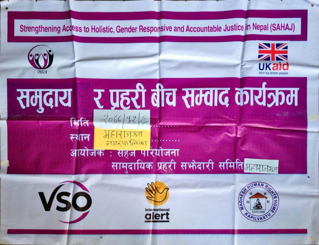 समुदाय र प्रहरी बीच सम्वाद कार्यक्रमलाई UKAid , VSO र international Alert मधेस मानव अधिकार गृह (महुरी हाेेम ) संस्थाहरु काे आर्थिक सहयोग अनि सहज परियाेजना र सामुदायिक प्रहरी साझेदारी समिति महाराजगन्ज अनि प्रहरी साझेदारी उदयपुर प्रहरी चाैकी काे संयुक्त अायाेजना मा सम्पन्न भएको छ ।