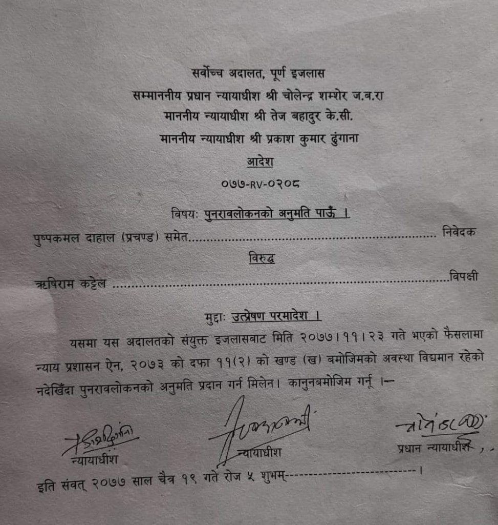 तत्काल नेपाल कम्युनिष्ठ पार्टीका अध्यक्ष ऋषिराम कट्टेलले आयोगमा दिएको निवेदन खारेज भएको थियो। त्यसपछि नेपाल कम्युनिष्ट पार्टी आफ्नो भएको दाबी गर्दै ऋषि कट्टेलले सर्वोच्चमा रिट दायर गरेका थिए। कट्टेलको पक्षमा फैसला गर्दै सर्वोच्चले फागुन २३ गते न्यायाधीशद्वय बमकुमार श्रेष्ठ र कुमार रेग्मीको संयुक्त इजलासले नेकपा खारेज गर्दै एमाले र माओवादी केन्द्र ब्युँताउने फैसला गरेको थियो।