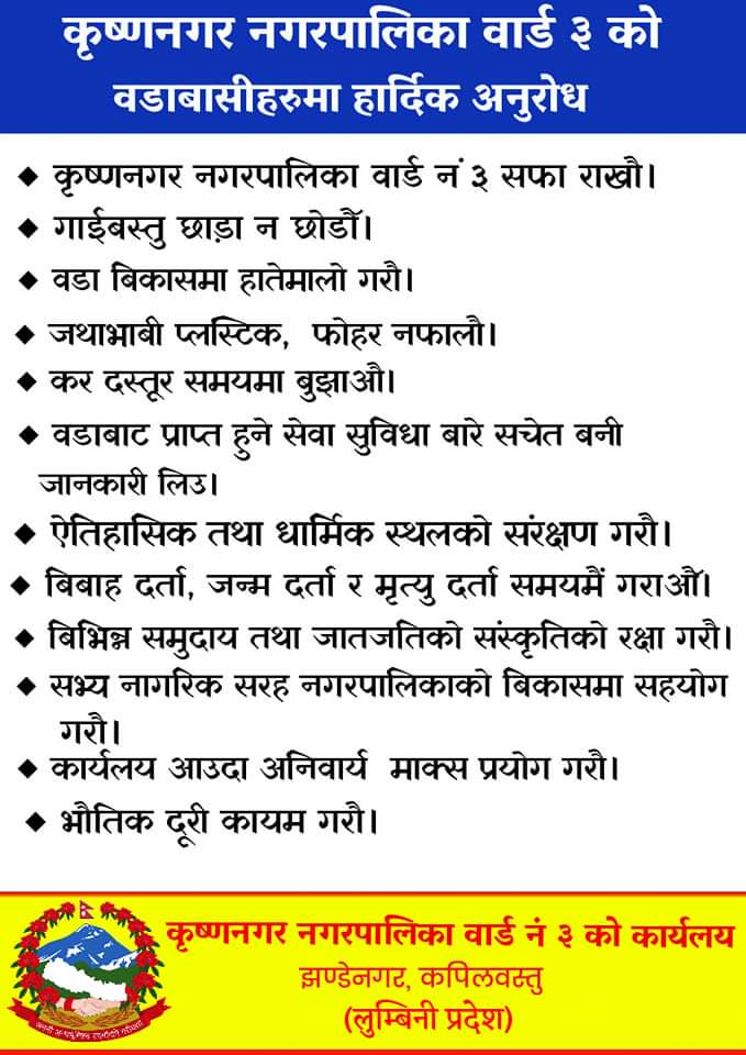 कपिलवस्तुमा लामो समय देखि निषेधाज्ञा जारी रहेकोछ। यो निषेधाज्ञामा गरीब असहाय अतिविपन्न तथा मजदुर वर्गहरुलाई निकै समस्या भइरहेको छ। कपिलवस्तुको दणिक्ष पश्चिममा रहेको कृष्णानगर नगरपालिकामा पनि लामो समय देखि जारी रहेको निषेधाज्ञाको असर निकै परेकोछ। दैनिक ज्याला मजदुरी, चिया पसल,पान पसल तथा सड़क को किनारामा साना साना‌ पसल दिन भरि संचालन गरि दुइ पैसा कमाएर आफ्नो परिवारको लागि दुई छाकको ब्यवस्था मिलाउदै आएका ती ब्यक्तिहरुको छाक आज भोलि कसरी पुगे होला?