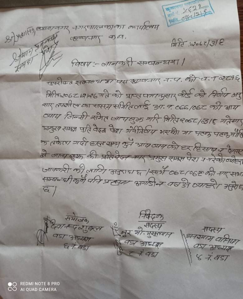 कृष्णनगर कार्यपालिका बोर्डले २०७८/०२/२७ गतेको दिन‌ आ.व.०७७/०७८ को आय व्यय/जिन्सी समेत जाचबुझ गरि २०७८/०३/०४ गते नगरप्रमुख समक्ष प्रतिवेदन पेश‌ गर्ने गरि ३ सदस्यीय समिती गठन गरि समितीका संयोजकमा देवानन्द शुक्ला सदस्यमा नुर मोहम्मद मुसलमान र घनश्याम बनिया रहने गरि जिम्मा दिइएको थियो।