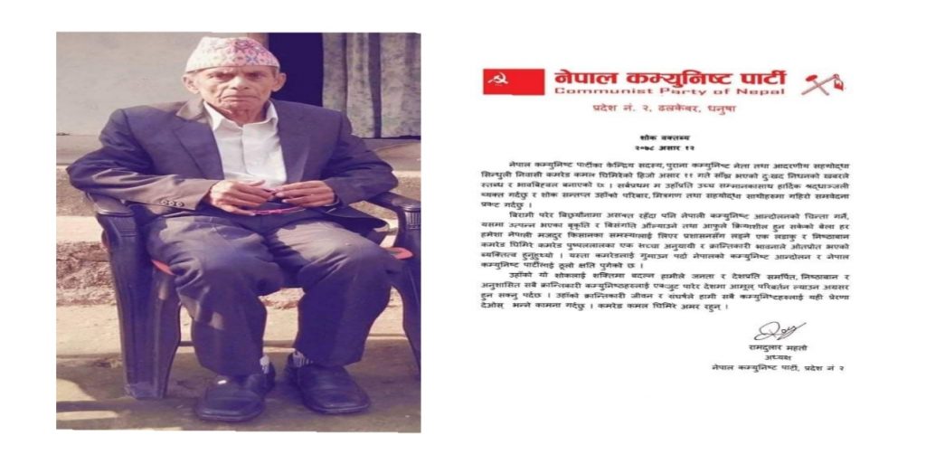 नेपाल कम्युष्टि पार्टी केन्द्रीय सदस्य सिन्धुली निवासी कमल घिमिरेको हिजो असार ११ गते साँझ निधन भएको छ । उहाँ एक पुराना कम्युनिस्ट नेता हुन् । उहाँप्रति नेपाल कम्युनिस्ट पार्टी प्रदेश २ कर्य समितिले शोक बक्तब्य जारी गरि गहिरो दुख प्रकट गर्दै श्रद्धाञ्जली व्यक्त गरेको छ भने शोक सन्तप्त उहाँको परिवार , मित्रगण तथा सहयोद्धा साथीहरुमा गहिरो समवेदना प्रकट गरेको बताएको छ ।