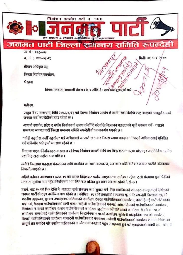 अहिले वर्तमान अवस्थामा covid-19 को कारण विदेशबाट फर्केर आएका तथा स्वदेशमा रहेका ठूलो संख्यामा युवा पिढींको मतदाता सूचीमा नाम नहुँदा निर्वाचनमा भाग लिन बाट बन्चित हुन सक्ने अवस्था रहेकोले यहि भाद्र १५ गते देखि नै मतदाता सूची संकलन कार्य सुचारु गर्न कोभिड- १९ र निशेधाज्ञाको मापदण्ड पूरा गरि रुपन्देही जिल्लाको १६ वटै स्थानीय तहहरुमा बुटवल उपमहा नगरपालिकाको कार्यालय, देवदह गाउँपालिकाको कार्यालय, कोटीहिमाई गाउँपालिकाको मझगावां, गैडहवा गाउँपालिकाको हाथी बजार, रोहिणी गाउँपालिकाको धकधई, ओमसतियाको गाउँपालिकाको कार्यालय , तिल्लोक्तमा न. पा. को कार्यालय, कंञ्चन गाउँपालिका, को कार्यालय,शुध्धोधन गाउँपालिकाको कार्यालय, सैनामैना न. पा. को कार्यालय , सेम्मरीमाई गाउँपालिकाको कार्यालय , सिद्धार्थनगर पालिकाको कार्यालय लु.स.न. पा.को कार्यालय , सियारी गाउँपालिकाको कार्यालय, मायादेवी गाउँपालिकाको कार्यालय, मर्चवारी गाउँपालिकाको कार्यालय, लगायत जिल्लाका विभिन्न क्षेत्र समेटिनेगरी उपयुक्त स्थानहरूमा एकहप्ताको अवधी सम्म अस्थायी मतदाता सूची संकलन केन्द्र तोकी मतदाता सूचीमा नाम दर्ता गर्नका लागि जोडदार माग गरिएको जनमत पार्टीका केन्द्रीय सचिव यादवले बताउनु भएको छ ।