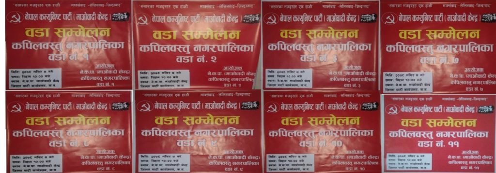 नेपाल कम्युनिस्ट पार्टी ( माओवादी केन्द्र ) कपिलवस्तुकाे जिल्लाका सबै वडामा सम्मेलन सम्पन्न भएको छ । केन्द्रिय निर्देश अनुसार वडा सम्मेलन गर्नु पर्ने भएकोले आज जिल्लाका सम्पुर्ण पालिकाको सबै वडामा सम्मेलन सम्पन्न भएको हो ।