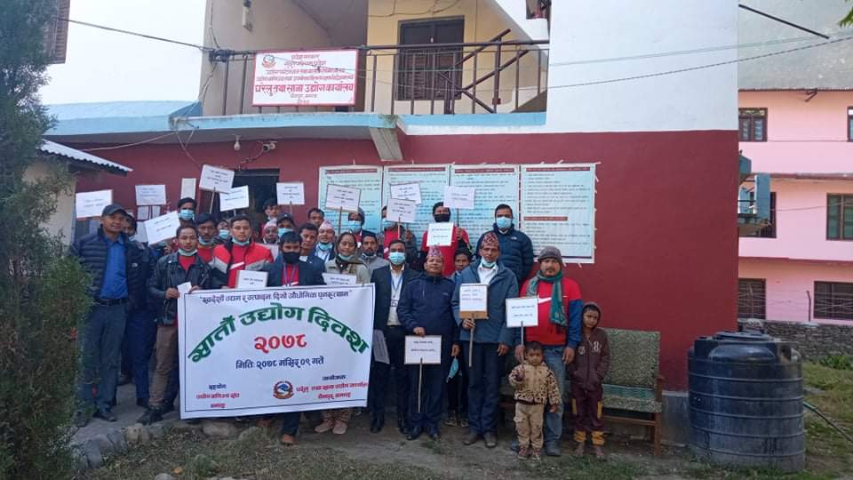 युवाले स्वदेशमै केही गर्नुपर्छ भन्ने हेतुले विभिन्न दिवसमा सक्दाे बेरोजगार राेक्ने र राेजगारी शृजना गर्ने घरेलु कार्यालयकाे उदश्य रहेकाे कार्यालय प्रमुख खडक बाेहराले बताए । आज घरेलु कार्यालयमा सञ्चालीत कार्यक्रममा घरेलु तथा साना उद्योग कार्यालय बझाङका प्रमुख खडक बाेहराकाे अध्यक्षतामा सुरु भएको कार्यक्रमका प्रमुख अतिथि उद्योग बाणिज्य सँघ बझाङका अध्यक्ष दान बहादुर सुर्मेली रहनु भएको थियाे भने कार्यक्रममा सबै जनप्रतिनिधि युवा पत्रकार सुरक्षाकर्मी लगाएत उपस्थिति रहेकाे थियाे । भने कार्यक्रम सञ्चालन घरेलुका बरिष्ठ सहजकर्ता दशरथ जप्रेलले गर्नु भएको हाे ।