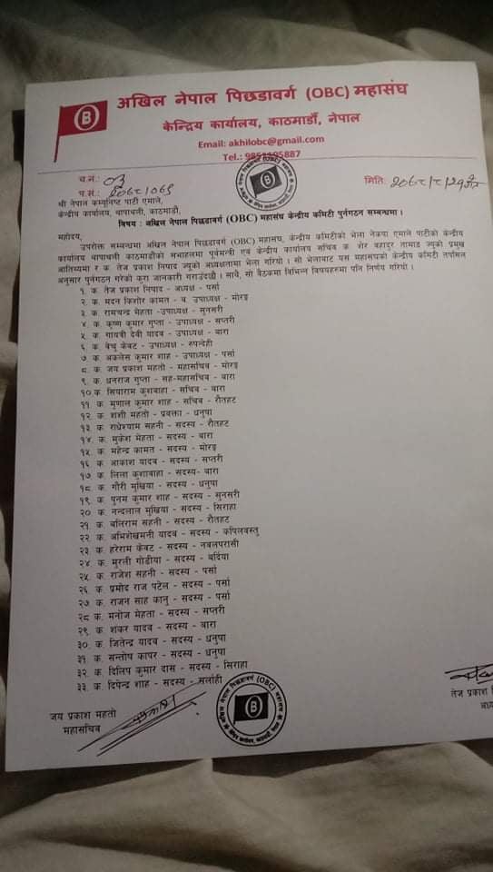 यसअघि निषाद अखिल नेपाल पिछडावर्ग महासंघको महासचिव भएर काम गरेका छन् । भेलाले कमिटीका सदस्यहरु पनि चयन गरेको छ ।