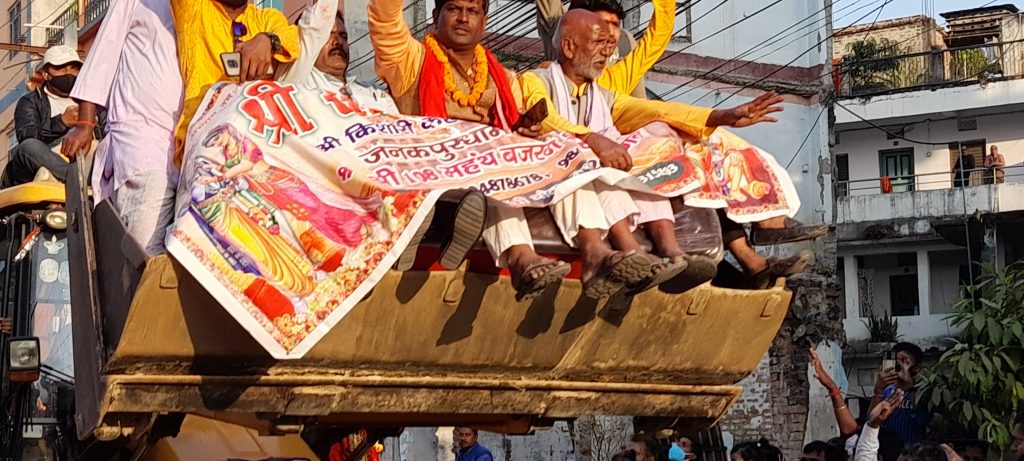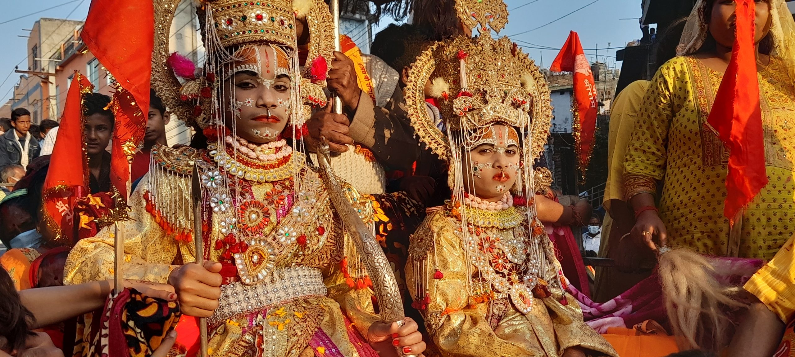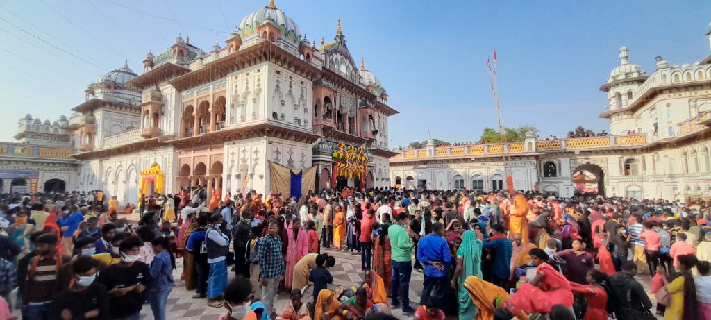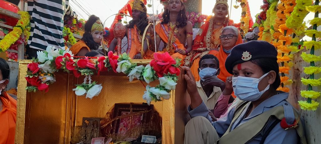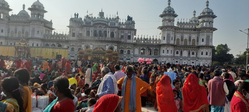 रामजानकी विवाहपञ्चमी महोत्सवको अन्तर्गत बुधवार दिउँसो स्व्यम्बर सम्पन्न भएको छ । दिउँसो दिउँसो १ः३० बजे राममन्दिरबाट आएको डोला बाजागाजाकासाथ रंगभूमि मैदान वारह विघमा पुगेको थियो । त्यहाँँ पहिलेदेखि जनकपुरधाम, २२ मंसिर । रामजानकी विवाह पञ्चमी महोत्सवअन्तर्गत बुधवार दिउँसो स्यम्बर सम्पन्न भएको छ । दिउँसो दिउँसो १ः३० बजे राम मन्दिरबाट आएको डोला बाजागाजाकासाथ रंगभूमि मैदान वारह विघामा पुगेको थियो । जहाँ पहिलेदेखि राखिएको जानकी माताको मूर्ति सु–सज्जित डोलाका मन्दिरका महन्थ, साधुसन्तलगायतद्वारा स्वागत गरेका थिए । जानकी मन्दिरका डोलाले राम मन्दिरका डोलालाई परिक्रमण गराई फूलमाला चढाई आरती पुजनपश्चात स्वय्म्बर विधिवत रुपमा सम्पन्न गरिएको थियो । स्वयम्वरपश्चात १२ विघाबाटै बुधवार दिउँसै शोभा यात्रा निकालिएको छ । दुवै मन्दिरका डोला साधुसन्त, श्रद्धालु भक्तजन तथा धनुषाका प्रमुख जिल्ला अधिकारी बन्धुप्रसाद गौतम, विभिन्न राजनीतिक दलका प्रतिनिधीसमेत सहभागि भएका थिए । शोभायात्रा पश्चात दुवै मन्दिरको डोला जानकी मन्दिरमा पु¥याइएको छ राखिएको जानकी माताको मूर्ति सुसज्जित डोलाका मन्दिरका महन्त, साधुसन्तलगायतद्वारा स्वागत गरेका थिए । त्यहाँ जानकी मन्दिरका डोलाले राम मन्दिरका डोलालाई परिक्रमण गराई फुलमाला चढाउछन् र आरती पुजन पश्चात स्वय्म्बर विधिवत रुपमा सम्पन्न भएको छ । स्वय्मवर पश्चात वाहर विघा बाटै बुधवार दिउँसै शोभा यात्रा निकालिएको छ । दुवै मन्दिरका डोला साधुसन्त, श्रद्र्धालु भक्तजन तथा धनुषाका प्रमुख जिल्ला अधिकारी बन्धु प्रसाद गौतम, विभिन्न राजनीतिक दलका प्रतिनिधीहरु समेत सहभागि भएका थिए । शोभा यात्रा पश्चात दुवै मन्दिरको डोल जानकी मन्दिरमा पुर्याइएको छ । आज राती जानकी मन्दिर परिषरमा भागवान राम र सीताको विवाह हुने छ ।