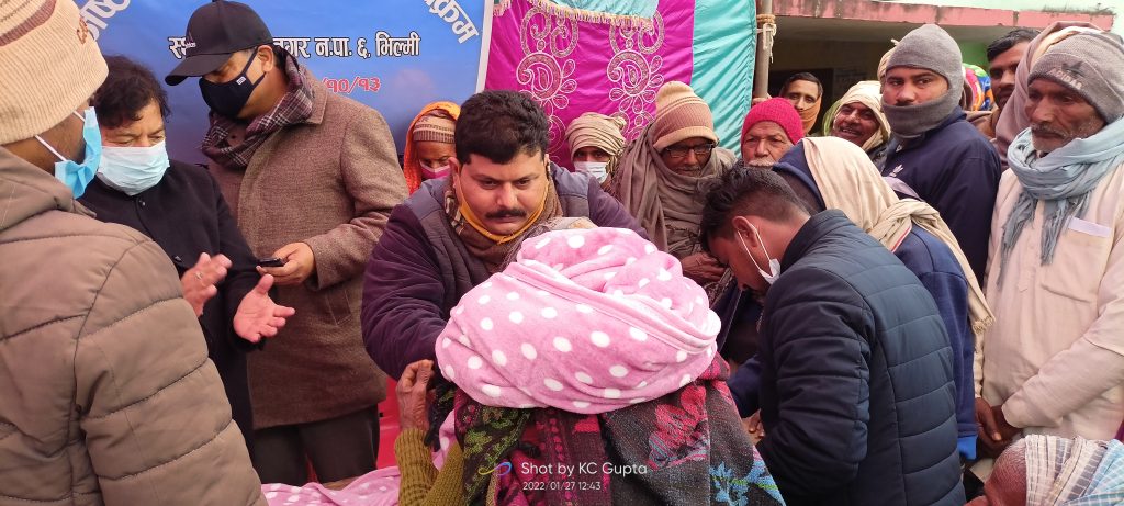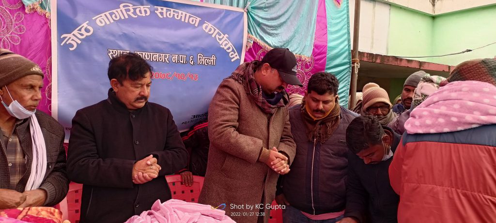 वडा कार्यालयको आयोजनामा ७० बर्ष माथि,जेष्ठ नागरिक दलित गरि ३ सय ९३ जेष्ठ नागरिकहरुलाई सम्मान स्वारुप कम्मल बितरण गरि सम्मानित गरिएको वडा अध्यक्ष देवानन्द शुक्लले जानकारी दिनु भयो । ज्येष्ठ नागरिकहरूलाई सबैले सम्मान गर्नुपर्ने बताउँदै चिसोबाट जेष्ठ नागरिक र बालबालिका बढी प्रभावित हुने भएकोले अति आवश्यक काम बाहेक उनीहरुलाई बाहिर नजान आग्रह गर्नु भयो ।