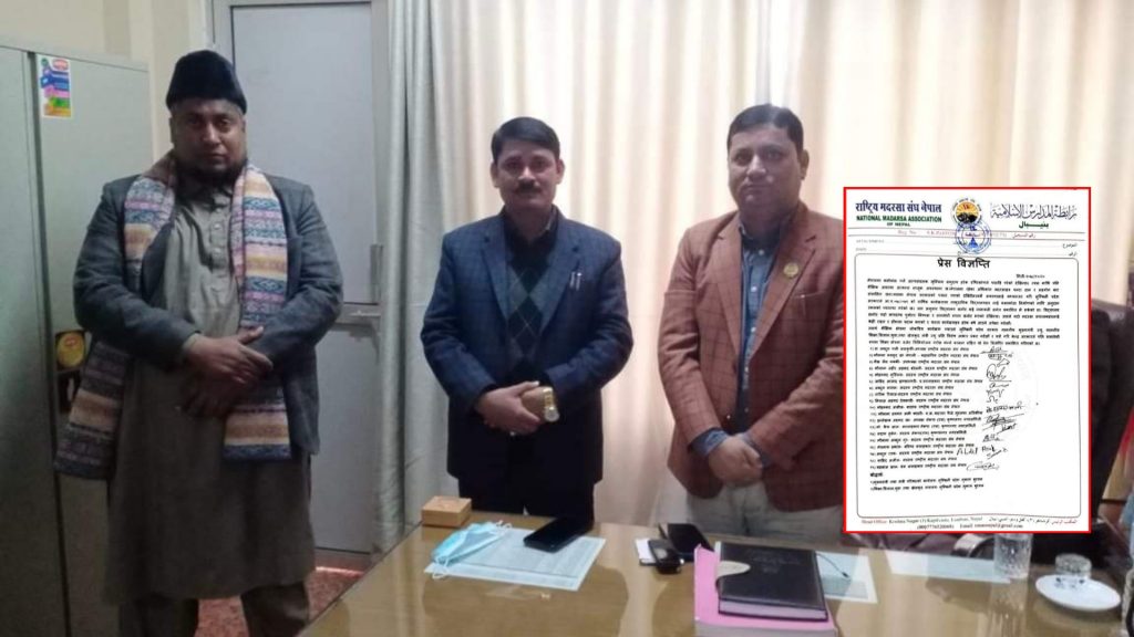 यसैगरी, केन्द्र सरकारले पनि समावेशी रुपमा शिक्षा क्षेत्रमा वजेट विनियोजन गरोस् भन्ने कामना सहित यो प्रेस विज्ञप्तिमा अब्दुल गनी अलकुफी-अध्यक्ष राष्ट्रीय मदरसा संघ नेपाल, मौलाना मशहुद खां नेपाली – महासचिव राष्ट्रीय मदरसा संघ नेपाल, शैख जैस मक्की- उपाध्यक्ष राष्ट्रीय मदरसा संघ नेपाल, मौलाना जहीर अहमद बरेलवी- सदस्य राष्ट्रीय मदरसा संघ नेपाल मोहम्मद मुस्लिम- सदस्य राष्ट्रीय मदरसा संघ नेपाल, जाहिद आजाद झण्डानगरी- प्र.सल्लाहकार राष्ट्रीय मदरसा संघ नेपाल, अब्दुल सलाम- सदस्य राष्ट्रीय मदरसा संघ नेपाल, तारिक रियाज-सदस्य राष्ट्रीय मदरसा संघ नेपाल, नियाज़ अहमद देवबन्दी- सदस्य राष्ट्रीय मदरसा संघ नेपाल, मोहम्मद अजीज- सदस्य राष्ट्रीय मदरसा संघ नेपाल, मौलाना‌ हस्मत अली कादरी- मदरसा फैजे मुस्तफा अतिकीया इन्तेखाब अहमद खां- अध्यक्ष नेकपा (एस) कृष्णनगर नगर समिति, मो. कैफ खान- सल्लाहकार नेकपा (एस) कृष्णनगर नगरसमित, सद्दाम हुसेन- सदस्य नेकपा(एस) कृष्णानगर नगरसमित, मौलाना अब्दुल नुर- सदस्य राष्ट्रीय मदरसा संघ नेपाल, मेघनाथ ढकाल- वरिष्ठ सलाहकार राष्ट्रीय मदरसा संघ नेपाल, अब्दुफल रउफ- सदस्य राष्ट्रीय मदरसा संघ नेपाल, शाहिद अजीज- सदस्य राष्ट्रीय मदरसा संघ नेपाल, शहबाज खान- प्रेस सलाहकार राष्ट्रीय मदरसा संघ