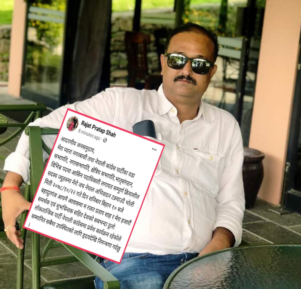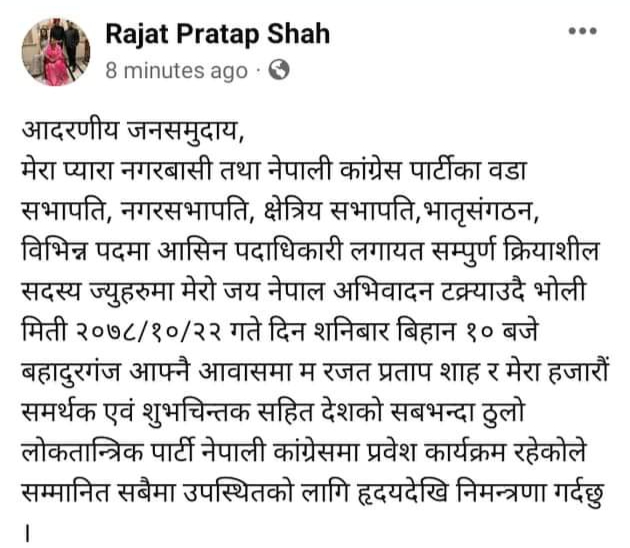 उहाँले लेख्नुभएको छ की मेरा प्यारा नगरबासी तथा नेपाली कांग्रेस पार्टीका वडा सभापति, नगरसभापति, क्षेत्रिय सभापति,भातृसंगठन, विभिन्न पदमा आसिन पदाधिकारी लगायत सम्पुर्ण क्रियाशील सदस्य ज्युहरुमा मेरो जय नेपाल अभिवादन टक्र्याउदै भोली मिती २०७८/१०/२२ गते दिन शनिबार बिहान १० बजे बहादुरगंज आफ्नै आवासमा म रजत प्रताप शाह र मेरा हजारौं समर्थक एवं शुभचिन्तक सहित देशको सबभन्दा ठुलो लोकतान्त्रिक पार्टी नेपाली कांग्रेसमा प्रवेश कार्यक्रम रहेकोले सम्मानित सबैमा उपस्थितको लागि हृदयदेखि निमन्त्रणा गर्दछु ।