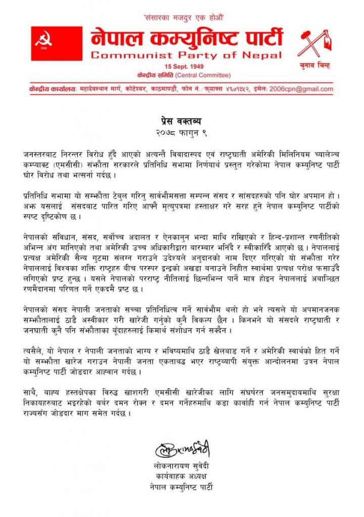 नेपाल र नेपाली जनताको भाग्य र भविष्यमाथि ठाडै खेलबाड गर्ने र अमेरिकी स्वार्थका हित गर्ने यो सम्झौता खारेज गराउन नेपाली जनता एकताबद्ध भएर राष्ट्रब्यापी संयुक्त आन्दोलनमा उत्रन नेपाल कम्युनिष्ट पार्टी आह्वान गरेको छ ।