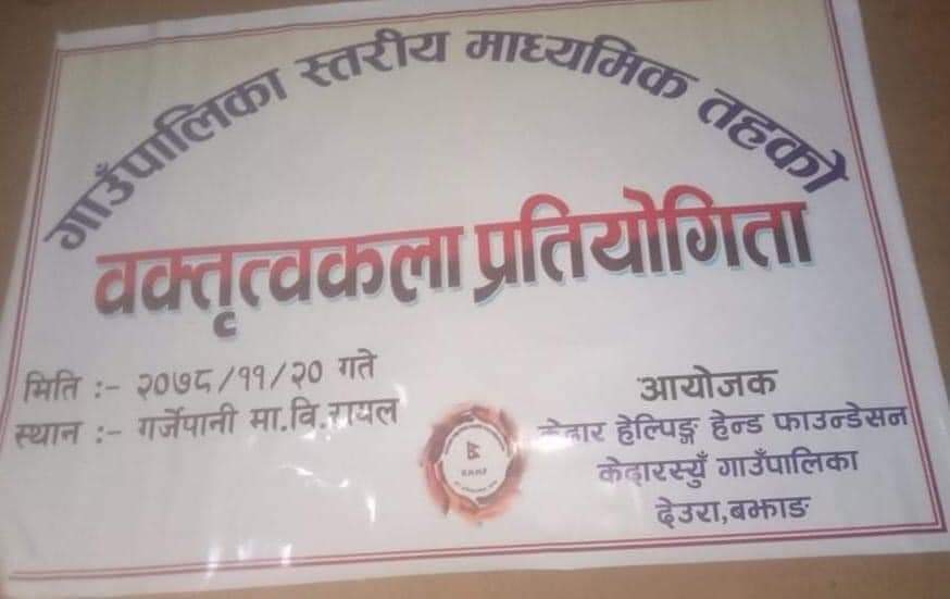 विभिन्न विद्यालय विच भएको वतृत्वकलामा फाउन्डेसनका अध्यक्ष मुकेश खातीकाे अध्यक्ष तामा सुरु भएको कार्यक्रमका प्रमुख अतिथि जिल्ला समन्वय समिति सदस्य पदम धामी बिशिस्ट अतिथि केदारस्यू गाउँपालीका उपाध्यक्ष निशा धामी रहनु भएको थियाे भने कार्यक्रम सञ्चालन पुरन मल्लले गर्नु भएको हाे । कार्यक्रममा निर्णायककाे भुमिका सुरेन्द्र खाती शैलेसले गर्नुका साथै कार्यक्रमलाई सहप्रायाेजक शँकर भण्डारी वडा नम्बर ९ का अध्यक्ष अहेन्द्र शाही फाउन्डेसनका पदाधिकारी उज्ज्वल बिष्ट ललित गुरुधामी लगाएत हजाराैँ जनसमुदायकाे उपस्थिति रहेकाे थियाे ।
