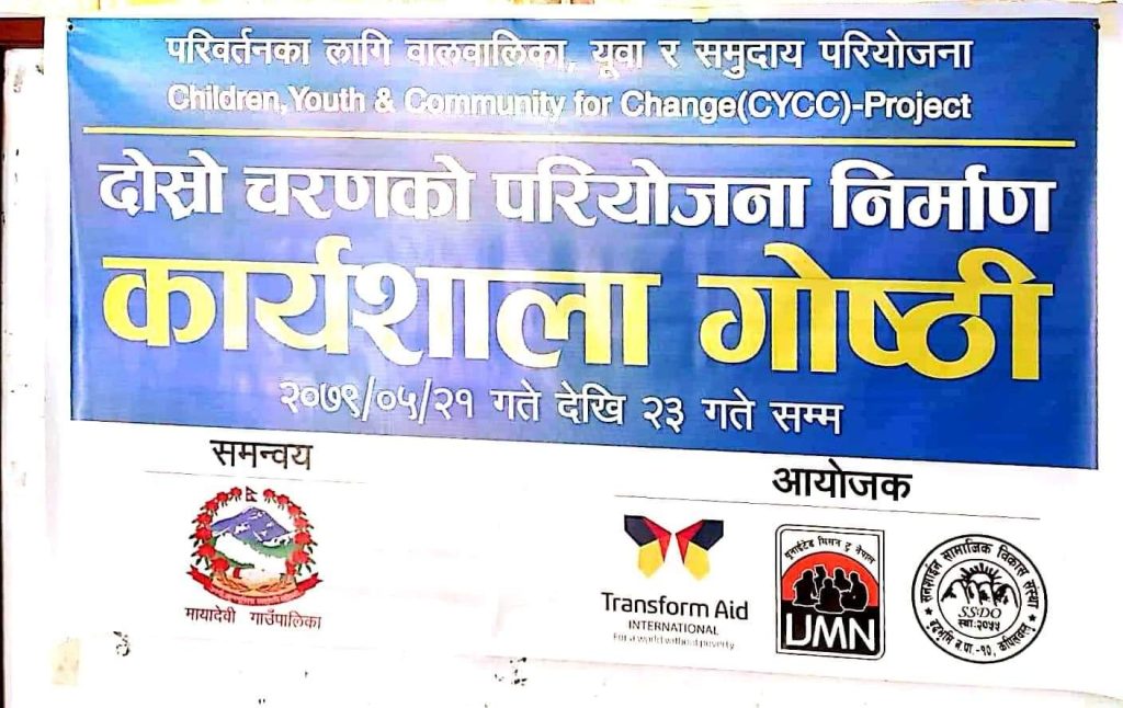 सनशाईन सामाजिक विकास संस्था र यूनाईटेड मिसन टू नेपालको साझेदारीमा मायादेवी गाउँपालिकामा संचालित परिवर्तनका लागि बालबालिका, यूवा र समुदाय परियोजना (CYCC) को दोस्रो चरणको कार्यक्रमकाको लागि उक्त कार्यशाला शुरु भएको हो । तौलिहवामा स्थित गौतमबुद्व होटलमा शुरु भएको कार्यशालामा कार्यक्रमको अध्यक्षता संस्थाका अध्यक्ष शिवलाल यादवले गर्नुभएको थियो भने मायादेवी गाउँपालिकाका अध्यक्ष वलिउद्विन मुसलमान प्रमुख अतिथिमा रहेको थियो ।