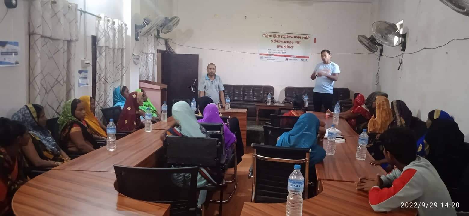 परियोजना अन्तरगत समुदायमा बिभिन्न किसिमले लैंगिक हिंसामा परेका महिलाहरुको क्षमता अभिबृद्धि गर्ने उद्धेश्यले कार्यक्रम आयोजना गरिएको थियो । कार्यक्रममा मायादेबी गाउँपालिकाको प्रमुख प्रशााकिय अधिकृत प्रमेश्वर यादव र पालिकाका कृषि शाखा प्रतिनिधी राम बिलाश मौर्याको सहभागितामा रहेको थियो । पालिकाले लैंंगिक हिंसा न्यूनिकरणको लागि गरेका प्रयासहरु , यस बर्ष लैंगिक हिंसा न्यूनिकरणको लागि कार्यक्रम र बजेटहरुको बारेमा पनि अन्तरकृया गरिएको हो ।