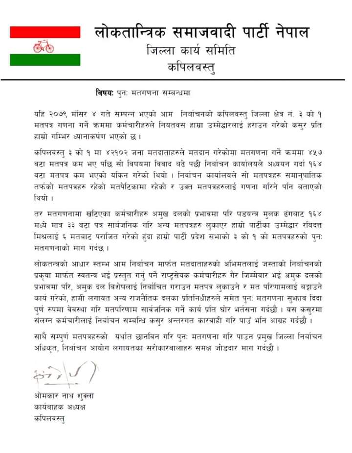 साथै सम्पुर्ण मतपत्रहरुको यर्थात छानविन गरि पुन: मतगणना गरि पाउन प्रमुख जिल्ला निर्बाचन अधिकृत, निर्बाचन आयोग लगायतका सरोकारवालाहरु समक्ष लोकतान्त्रिक समाजबादि पार्टीका कपिलवस्तुक कार्यबाहक अध्यक्ष ओमकार नाथ शुक्लले प्रेस बिज्ञप्ति जारी गर्दै माग गरेका छन्।