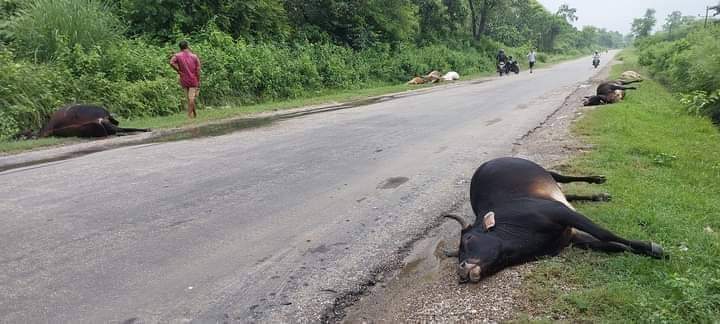 जिल्लाको बुद्धभुमी नगरपालिकामा रात्री बसले ठक्कर दिदा १० गाइ गोरुको मृत्यु भएको छ । जसमा ५ गाइ र ५ गोरुको घटनास्थलमै मृत्यु भएकोर ४ वटा पशु घाइते रहेको जिल्ला प्रहरी कार्यालय कपिलवस्तुका डिएसपि मिन बहादुर घलेले बताएका छन् ।