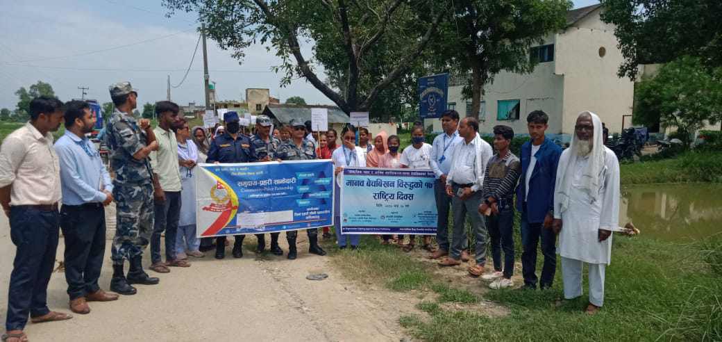 “सामाजिक न्याय र आर्थिक सशाक्तिकरण : मानव बेचविखनको निर्मूलन” भन्ने नाराको साथ चकरचौडाको नेपाल भरत बोडरबाट शुरु भएको ¥यालीमा “सबैमिली गरौ विपतको सामना , मानव बेचबिखनको बिरोध हाम्रो कर्तव्य र चाहाना” , “शैक्षिक जनचेतना बढाऔं , मानव बेचबिखन अन्त्य गरौँ ”,“लैङ्गिक हिंसा हटाऔ: मानव बेचबिखन अन्त्य गरौं ” लगायत प्ले कार्ड साहित सनशाईन सामजिक विकास संस्थाका कार्यकारी निर्देशक शम्भु प्रसाद हरिजन , आनन्द कुमार MSS भारतीय सिद्धार्थनागर , नेपाल प्रहरी, सशस्त्र प्रहरी, मानव बेचबिखन विरुद्ध अभियान चलाउने संघ संस्था , विद्यार्थी, बालक्लब , युवाक्लब , महिला समुहको सहभागिता रहेको थियो ।