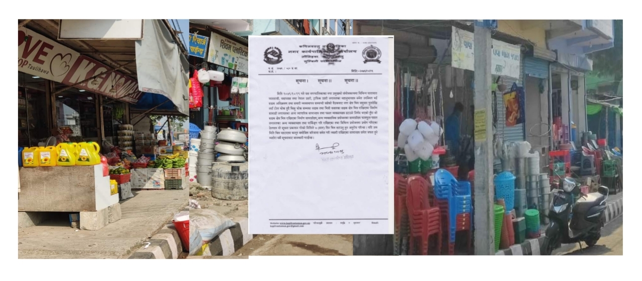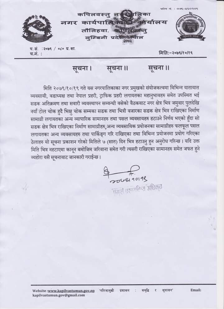 गत बर्ष माघ १९ गते कपिलवस्तु नगरपालिकाले नगरबासीमा एक सूचना जारी गर्दै बाटो अतिक्रमण गर्नेलाइ सात दिनभित्र सो कार्य बन्द गर्न अल्टिमेटम दिएका थियो । बाटोमा पसल थाप्ने , निर्माण समाग्री थन्काउने लगायत कार्यले बाटो वा फुटपाथ अतिक्रम गर्नेलाइ सात दिन भित्र त्यसता कार्य कार्य गरेको भए हटाउन अल्टिमेटम दिइएको थियो भने सूचनालाइ अटेर गरे आवश्यक कारबाही समेत गर्ने बताइएको थिए ।