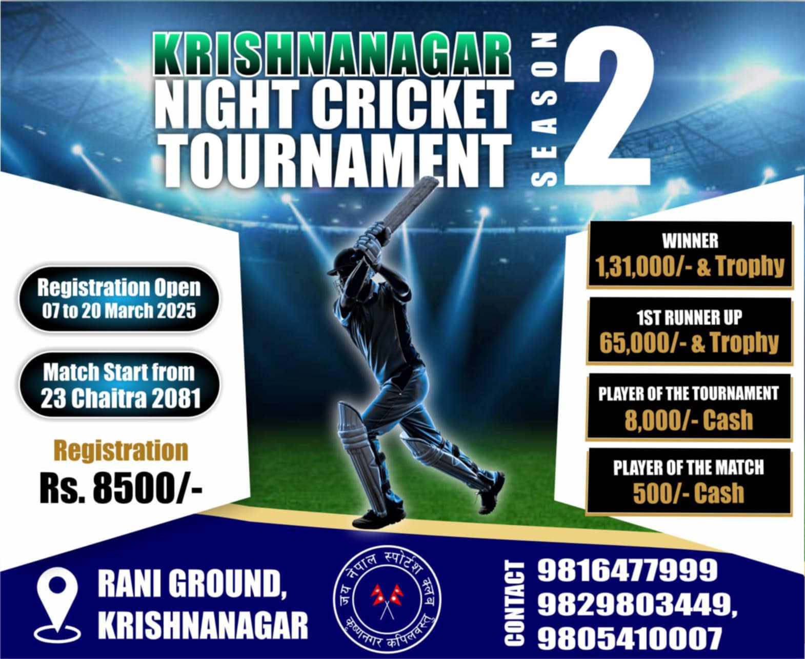 कपिलवस्तुको कृष्णनगरमा “नाइट क्रिकेट टूर्नामेन्ट – सीजन २” आगामी चैत्र २३ गते (५ अप्रिल २०२५) देखि सुरु हुँदैछ। जय नेपाल स्पोर्ट्स क्लबद्वारा आयोजित यो प्रतियोगिता रानी ग्राउण्ड, कृष्णनगर–२ मा हुने छ। खेलकुदलाई प्रवर्द्धन गर्दै युवा खेलाडीहरूलाई अवसर प्रदान गर्ने उद्देश्यले आयोजना गरिएको यो प्रतियोगिता नेपाली टोलीहरूका लागि मात्र खुला गरिएको छ। २१ वर्षमुनिका खेलाडीहरूले अनिवार्य रूपमा नागरिकता प्रमाणपत्र बुझाउनुपर्ने नियम राखिएको छ।