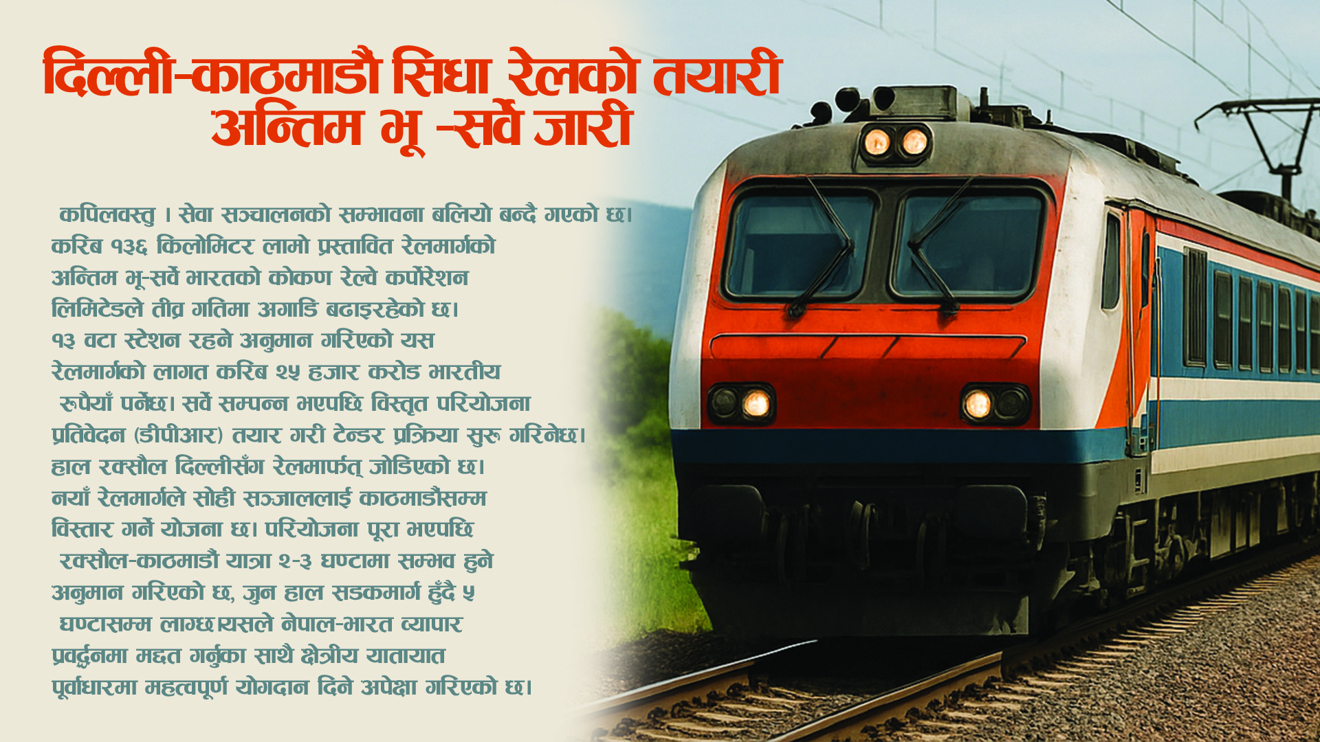 काठमाडौं – भारतको रक्सौलदेखि नेपाल राजधानी काठमाडौंसम्म सीधा रेल सेवा सञ्चालनको सम्भावना बलियो बन्दै गएको छ। करिब १३६ किलोमिटर लामो प्रस्तावित रेलमार्गको अन्तिम भू–सर्वे भारतको कोकण रेल्वे कर्पोरेशन लिमिटेडले तीव्र गतिमा अगाडि बढाइरहेको छ।