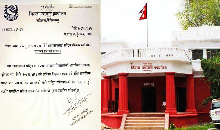 कपिलवस्तु । जिल्ला प्रशासन कार्यालय कपिलवस्तुले शनिबार (साउन १७ गते) पनि राष्ट्रिय परिचयपत्र (National ID) सेवाको सुविधा उपलब्ध गराउने भएको छ।