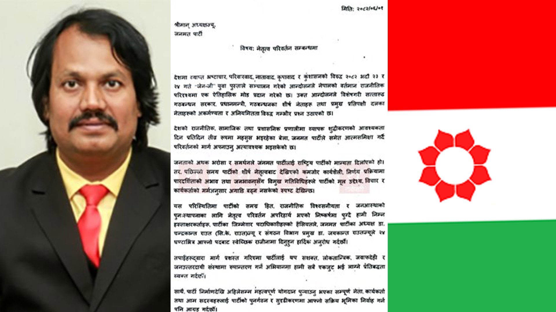 काठमाडौँ । जनमत पार्टीभित्र आन्तरिक असन्तुष्टि तीव्र बन्दै गएको छ। पार्टीका शीर्ष नेताहरूले अध्यक्ष डा. सिके राउत र संगठन विभाग प्रमुख जयकान्त राउतलाई २४ घण्टाभित्र राजीनामा दिन माग गरेका छन्।