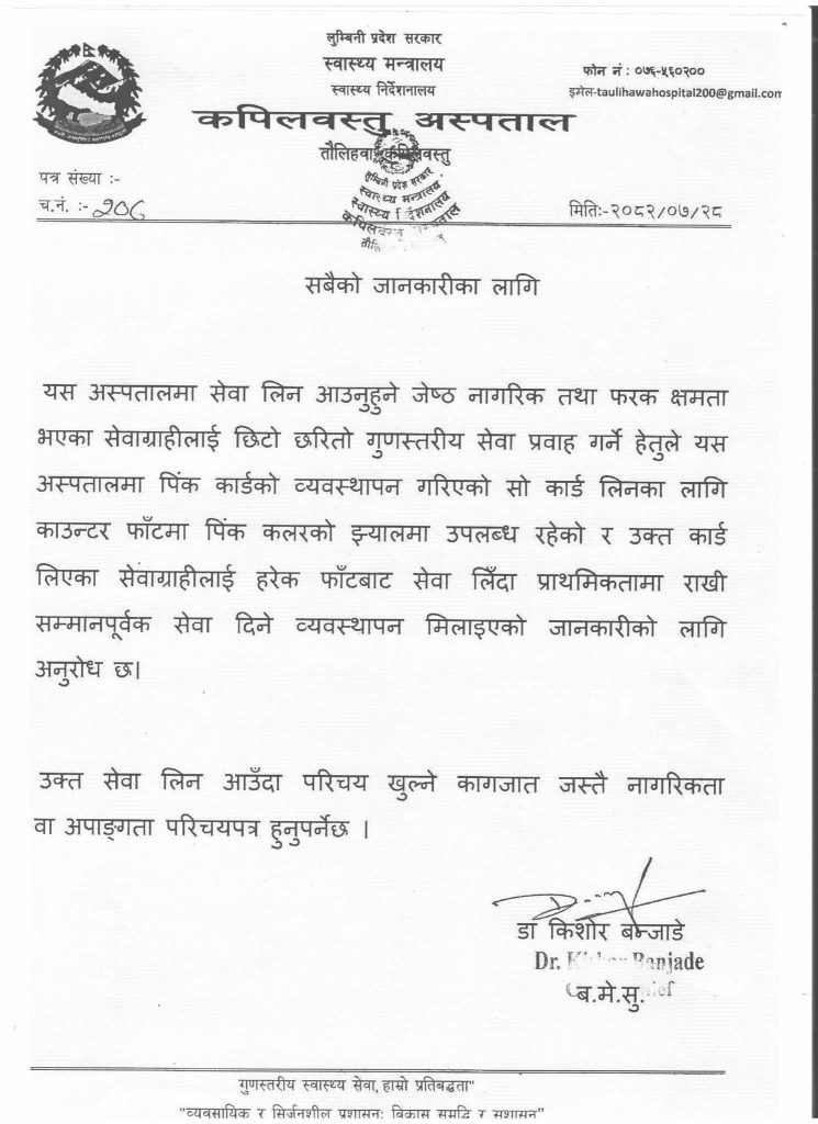 कपिलवस्तु — कपिलवस्तु अस्पतालले अब ज्येष्ठ नागरिक र फरक क्षमता भएका सेवाग्राहीलाई उपचारका प्रत्येक चरणमा सहज र सम्मानजनक सेवा दिने लक्ष्यसहित नयाँ व्यवस्था लागू गरेको छ। अस्पतालले उनीहरूलाई छिटो, छरितो र कष्टविहीन सेवा उपलब्ध गराउन विशेष ‘पिंक काउन्टर’ सञ्चालनमा ल्याएको हो।