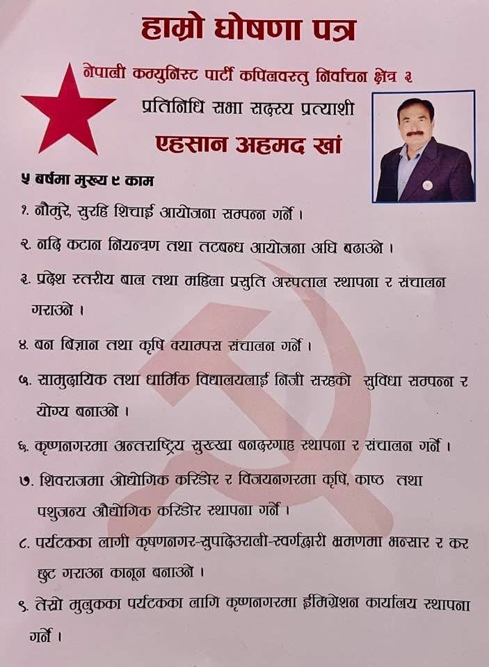 नेपाली कम्युनिस्ट पार्टीका प्रतिनिधि सभा सदस्यका प्रत्याशी एहसान अहमद खाँले कपिलवस्तु क्षेत्र नं. ३ का लागि आफ्नो चुनावी घोषणापत्र सार्वजनिक गरेका छन्।